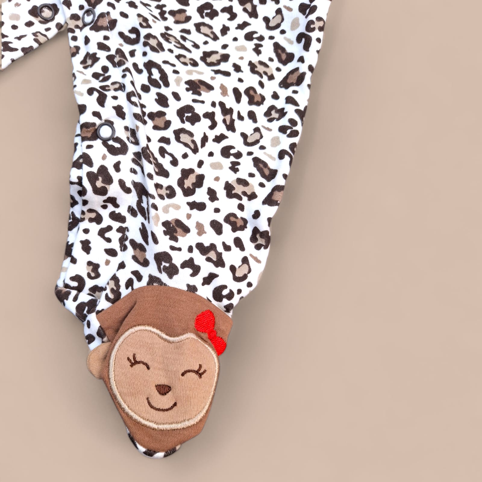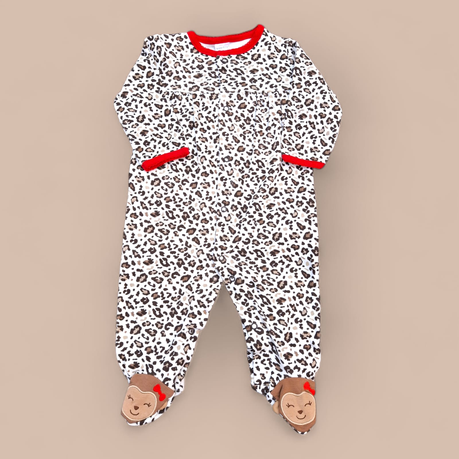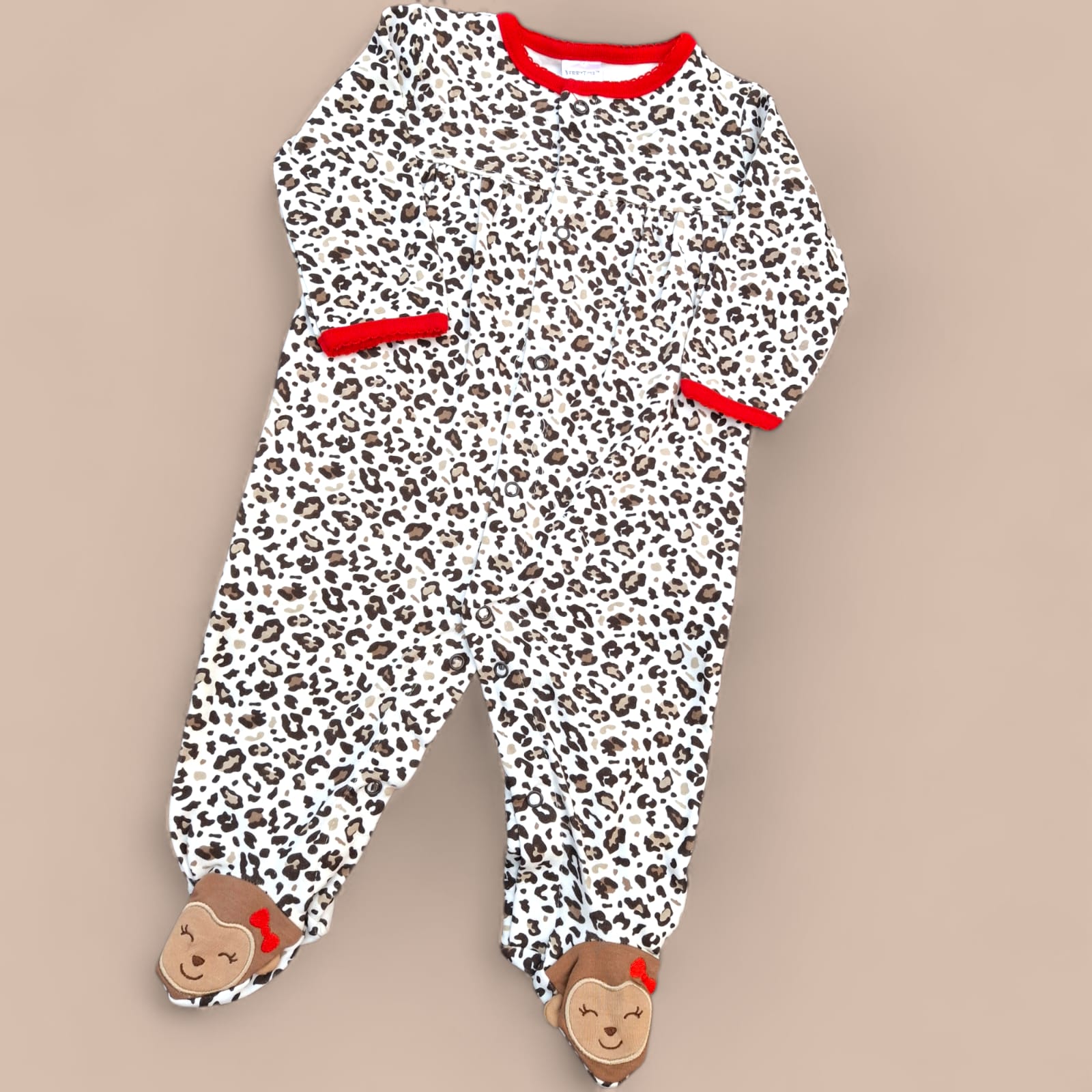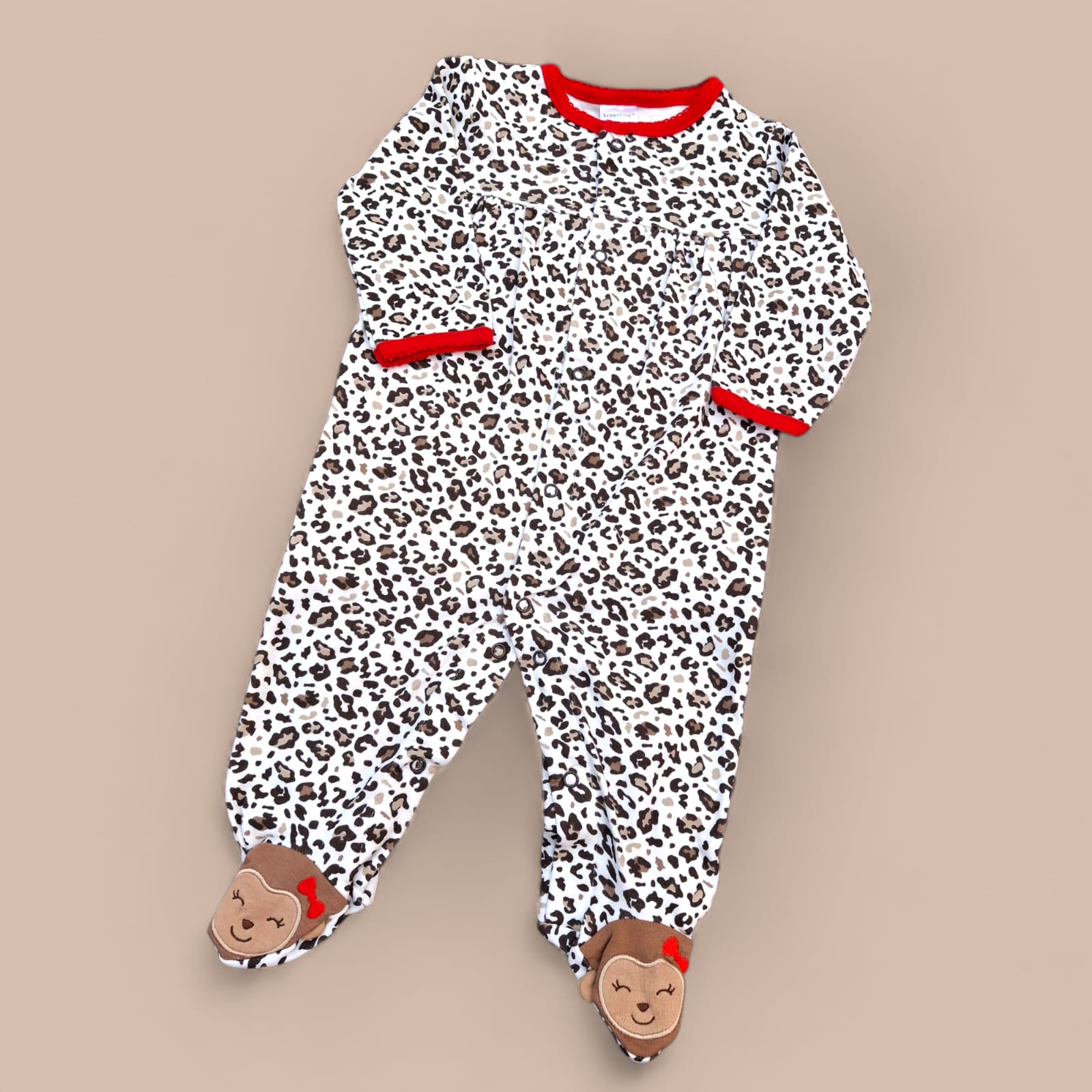 Featuring a classic leopard print pattern accented with bold red trim, this romper stands out with charming animal face appliqué detailing on the feet for an extra touch of fun.
